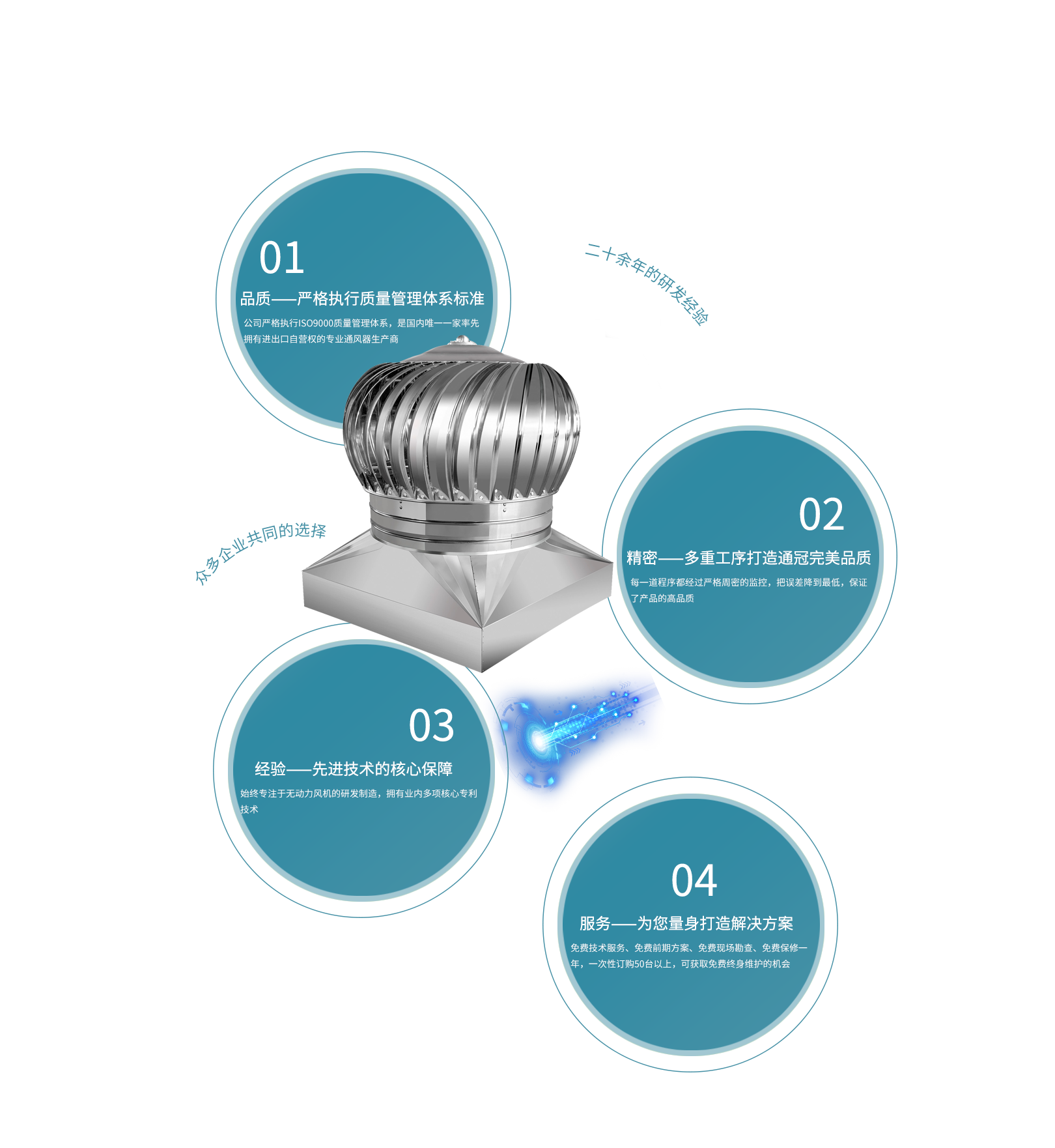 1、弧形風(fēng)葉是經(jīng)過科學(xué)的計(jì)算的最佳結(jié)果,能嚴(yán)格保證工作狀態(tài)無動力風(fēng)機(jī) 下絕不會讓雨水侵入。排風(fēng)效率高,只...